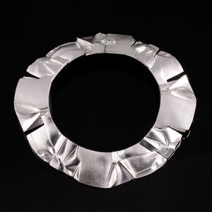 While gold represents vibrant and passionate elements for Weckström, silver, on the other hand, conveys cool, restrained, and subdued power. Weckström's first silver jewelry collection was named Space Silver, as it coincided with the exploration of space, including the first moonwalk that occurred in the same year. The themes of the collection revolved around space, science fiction, and psychedelic dreamscapes.